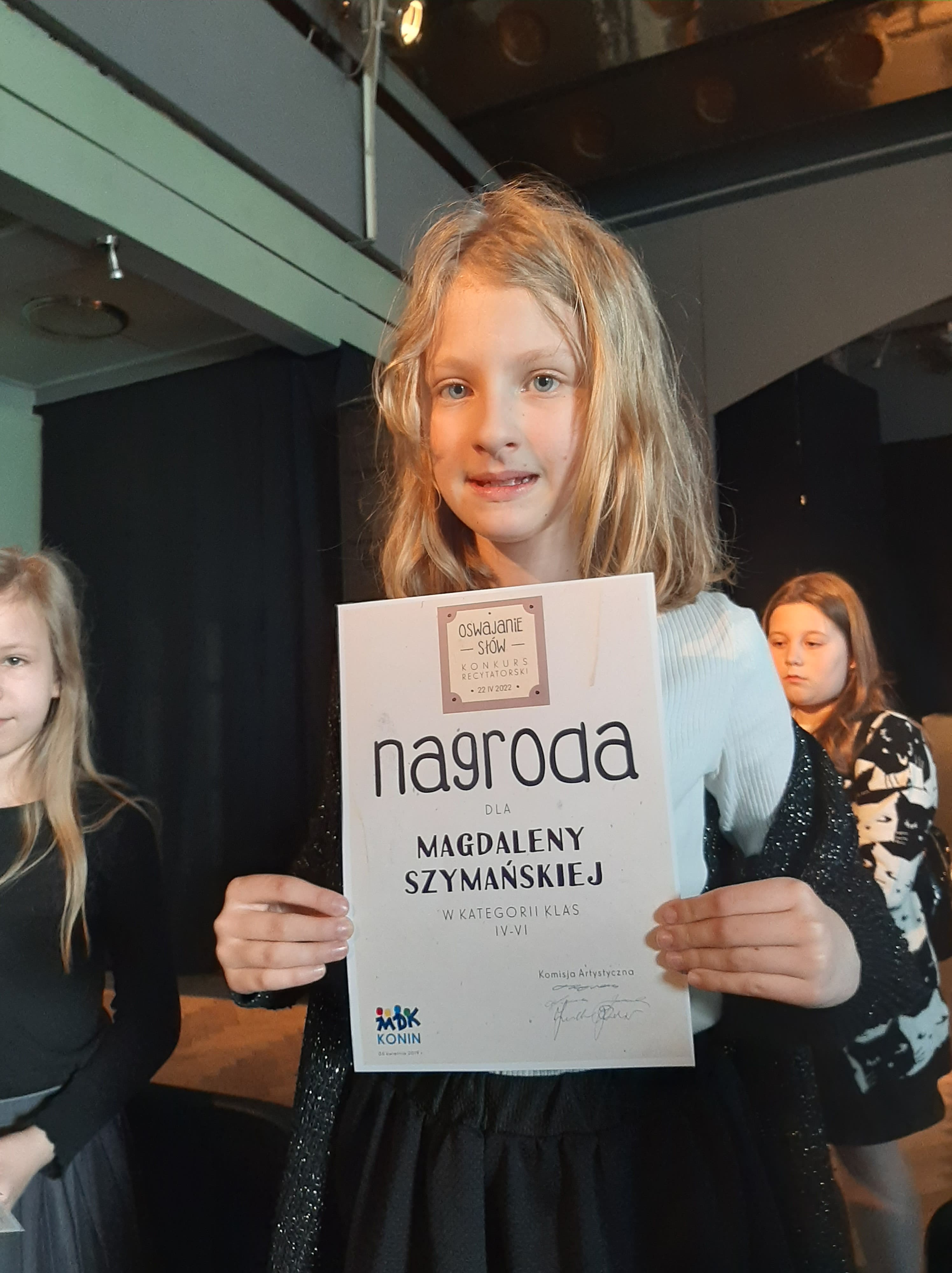 22 kwietnia 2022 r. odbył się w MDK konkurs recytatorski "Oswajanie Słów". Naszą szkołę reprezentowała szczęśliwa siódemka: Hanna Konstanciak z klasy III c, Joanna Kowalska z klasy III c, Łucja Szymczak z klasy II a, Laura Walczak z klasy III c, Szymon Wysokowicz z klasy II c, Olga Powietrzyńska z klasy IV b, Magdalena Szymańska z klasy IV c. Nasi reprezentanci recytowali wiersze Ewy Mleko, Jana Brzechwy, Marii Konopnickiej, Aleksandra Fredro, Danuty Wawiłow, Wandy Chotomskiej, Marii Terlikowskiej. Cała grupa odważnie się prezentowała na scenie i "oswajała słowa" w prezentowanych wierszach.