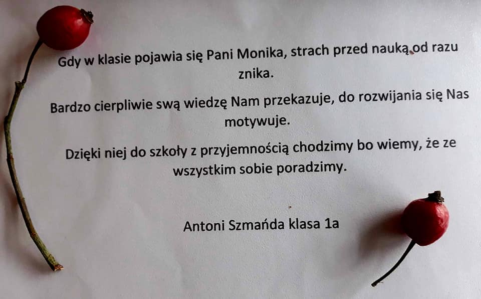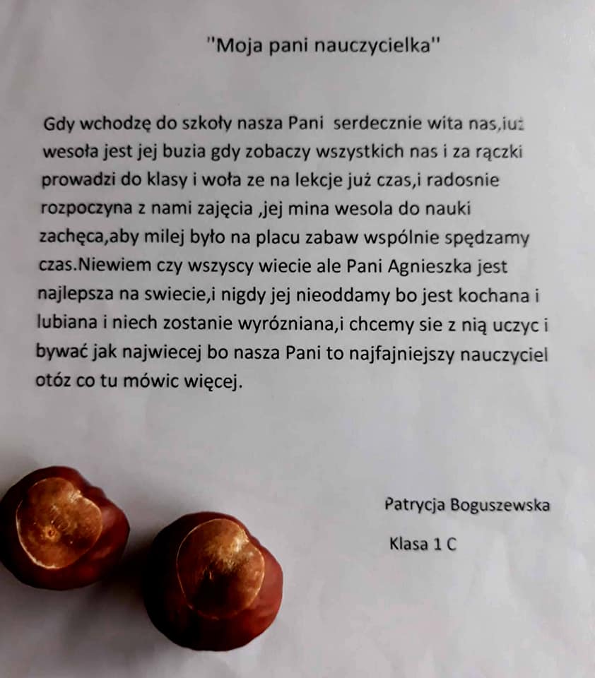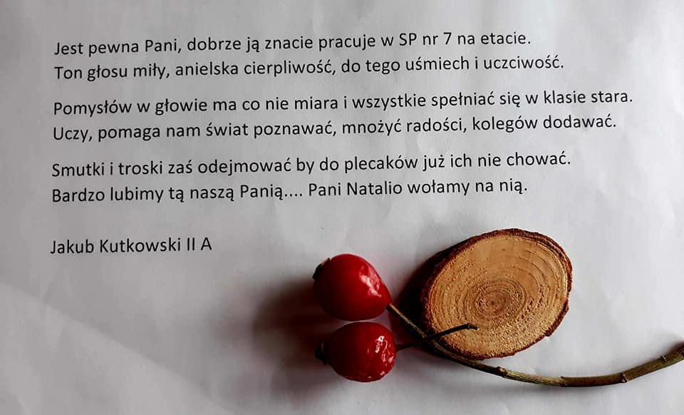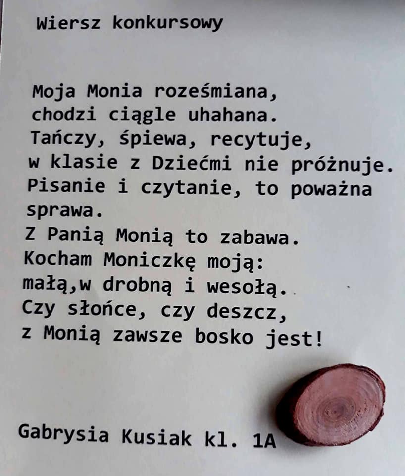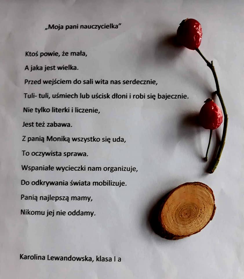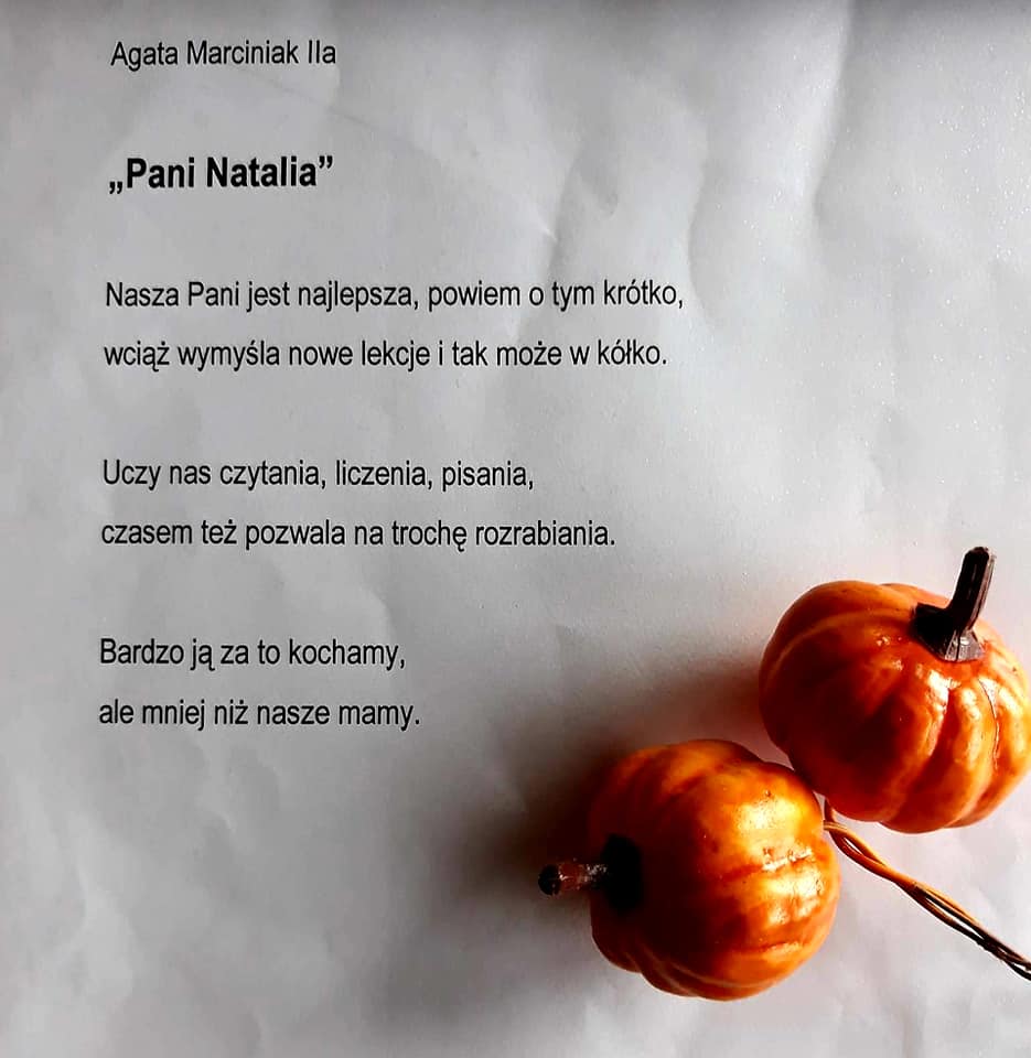Poezja to sztuka, talent....ogromna moc słowa. W naszej szkole nie brakuje poetyckich talentów, co udowodnili Laureaci szkolnego konkursu poetyckiego pt. "Moja Nauczycielka-Mój Nauczyciel". To duma i radość. Gratulujemy Wam! Mamy nadzieję i czekamy na kolejne, piękne wiersze. Trzymamy kciuki i wierzymy, że będziecie dbać o Wasz wyjątkowy talent - dar. Podsumowanie konkursu i wręczenie nagród przez Dyrektora SIÓDEMKI - Pawła Kawkę odbyło się w dniu 27 października.