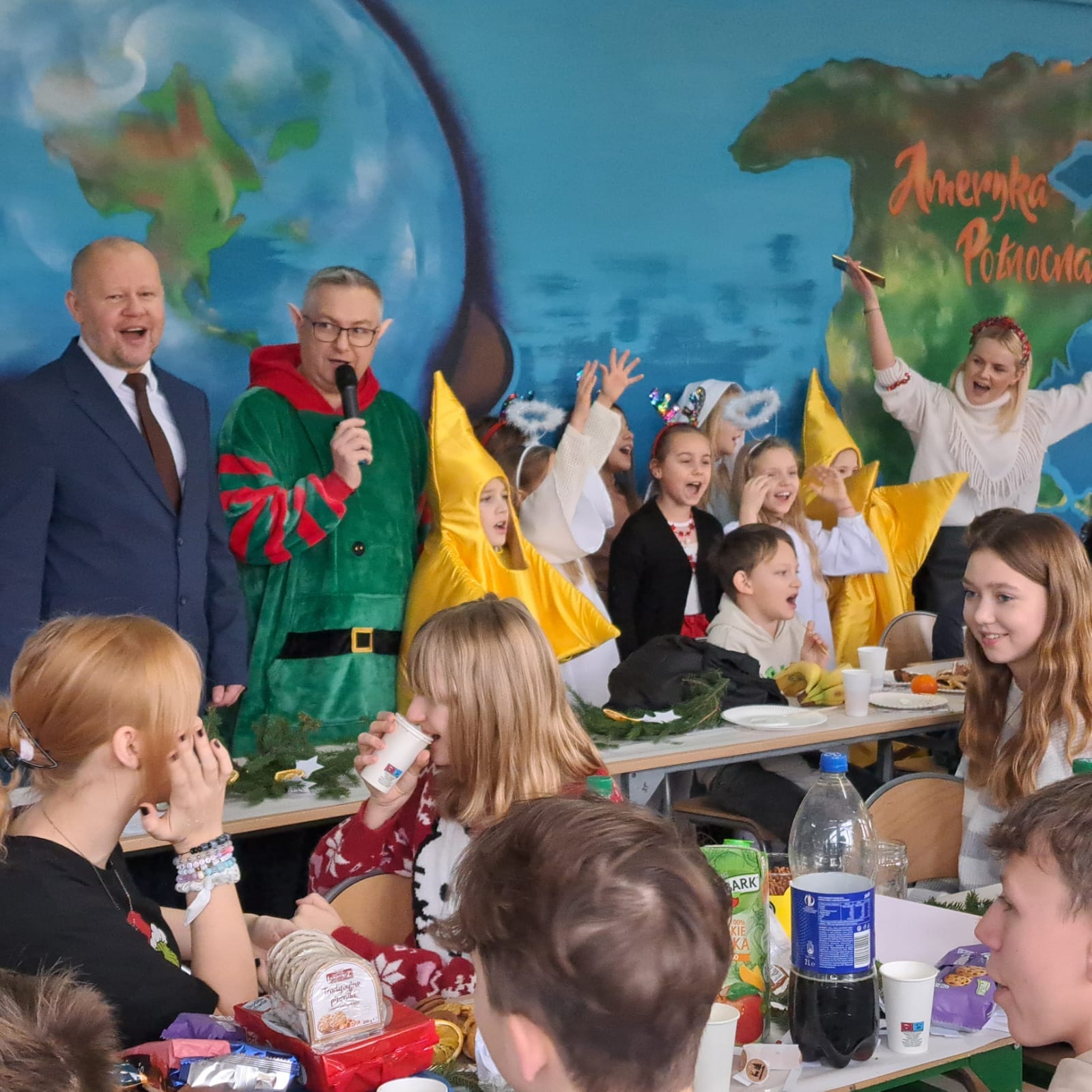 Dyrektor Siódemki złożył całej Społeczności Siódemki świąteczne życzenia, natomiast elfiątka wręczyły podziękowania dla każdej klasy za piękne przygotowanie nakrycia do wigilijnego stołu.