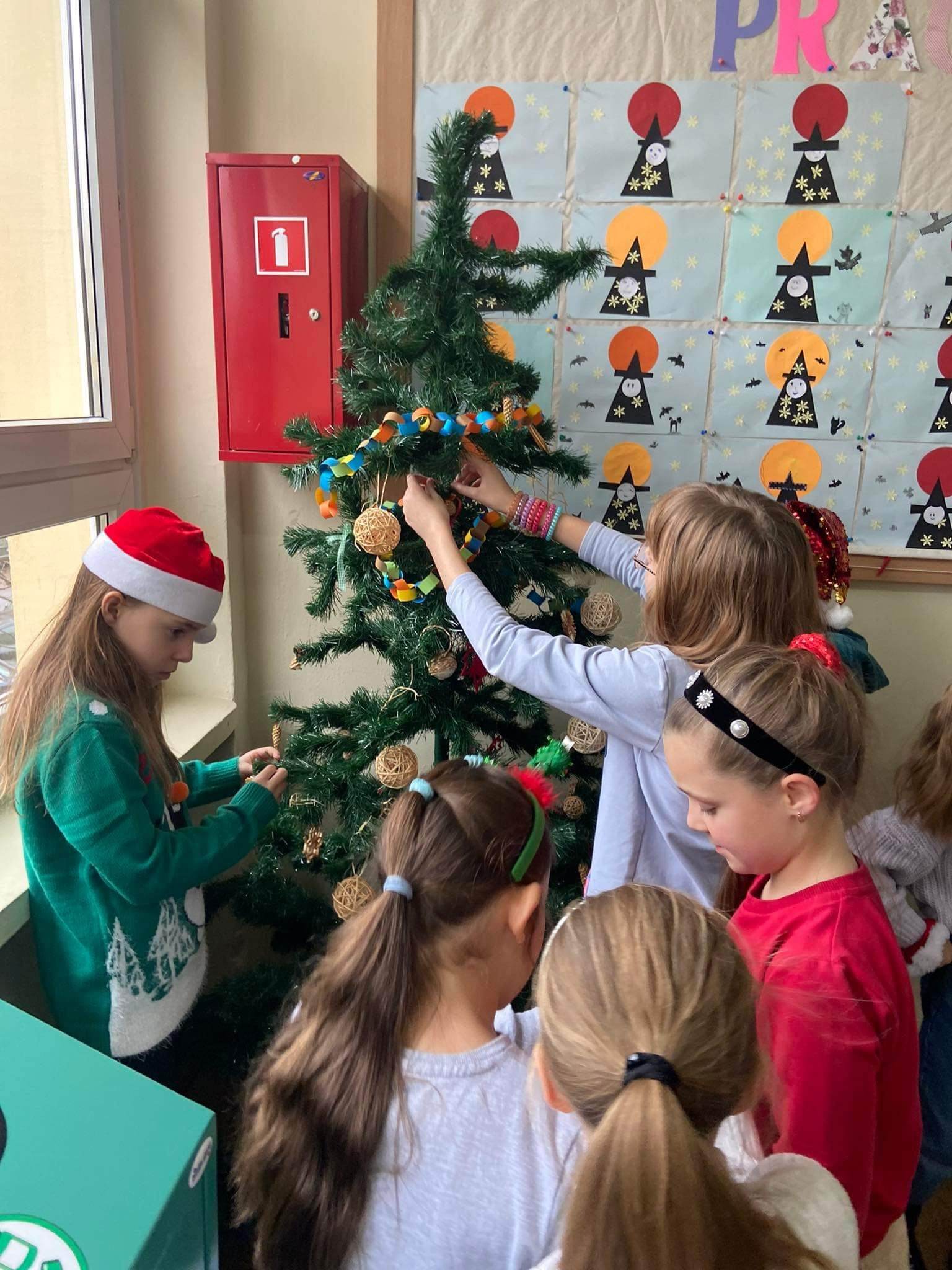 W SIÓDEMCE wszyscy wiedzą, że święta za pasem. Atmosferę nadchodzącego Bożego Narodzenia poczuliśmy już 5 grudnia, włączając się w inicjatywy samorządu uczniowskiego. W poniedziałek wspólnie ubieraliśmy dwie piękne, zielone choinki, które stanęły w holu szkoły. Zabawa była wspaniała i... smakowita, bowiem, oprócz tradycyjnych ozdób, na drzewkach zawisły pachnące pierniki. Teraz każdy, wchodząc do szkoły, może poczuć ich przyjemny zapach. We wtorek świętowaliśmy mikołajki. Część uczniów postanowiła tego dnia wręczyć sobie drobne upominki, niektórzy dostali od Mikołaja rózgi :), a inni świąteczne skarpety lub kubki. Większość z Nas natomiast założyła tego dnia czapki Mikołaja, więc wyglądaliśmy na przerwach jak pomocnicy świętego i nie byliśmy pytani. W końcu kto odpytuje Mikołaja?!?! Ostatnim zadaniem w minionym tygodniu było wykonanie łańcucha zdobiącego nasze szkolne choinki. Każda klasa miała więc sporo roboty, ale efekt okazał się wspaniały. Choinki są kolorowe, pachnące, a łańcuchów wystarczyło nawet, by udekorować klasowe drzewka.