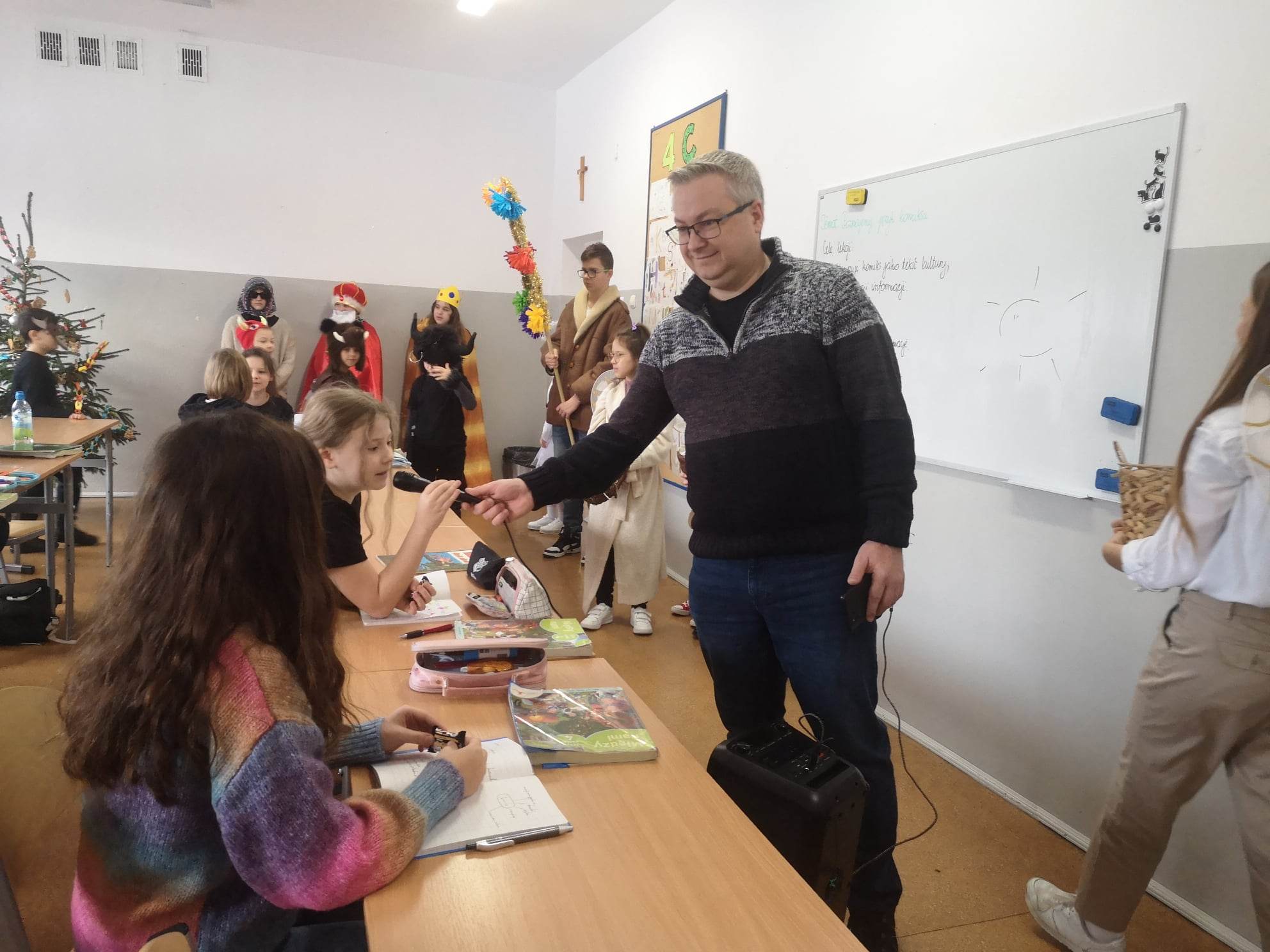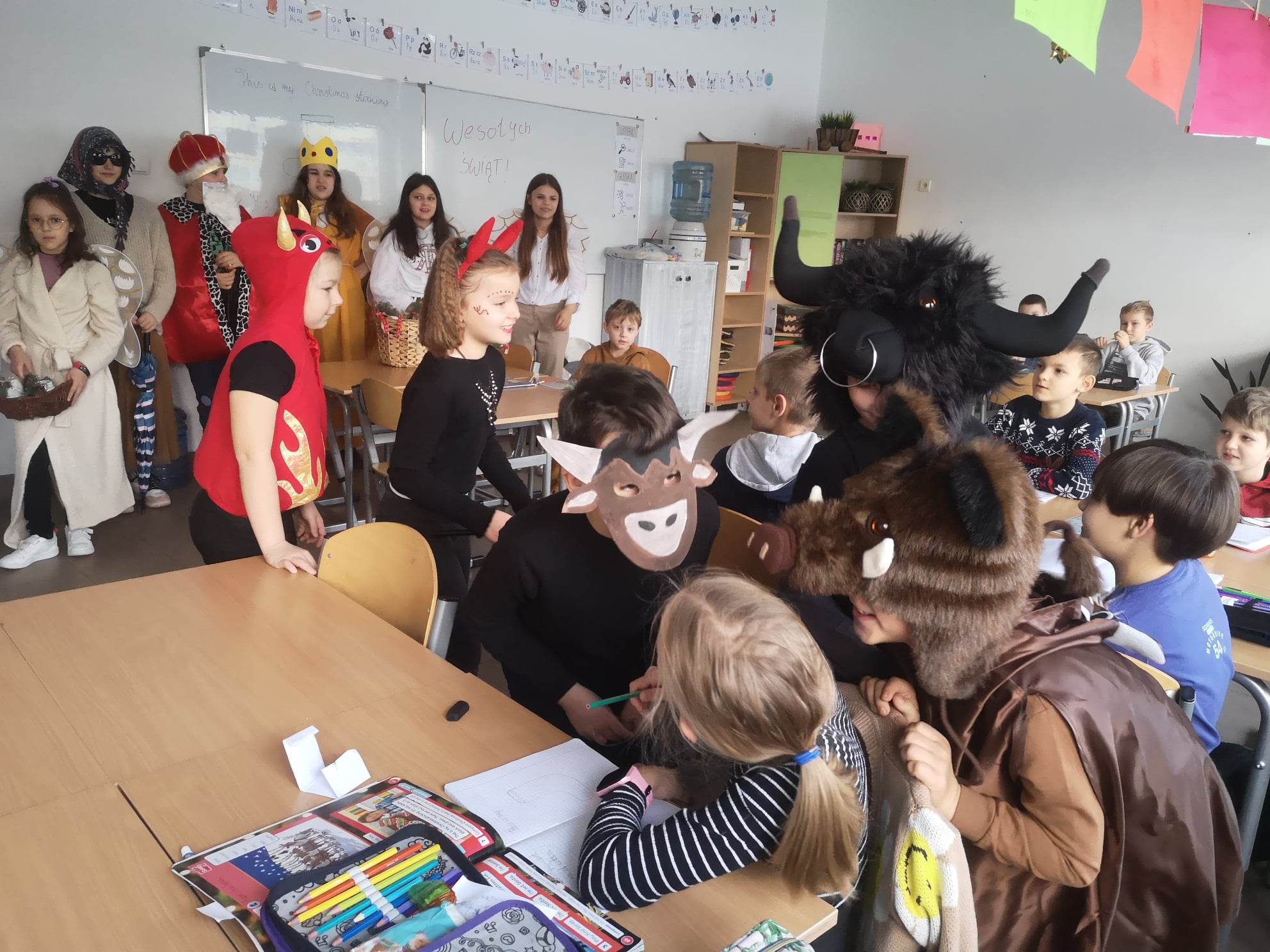 Tydzień przedświąteczny obfitował w naszej szkole w niespodzianki. W przygotowaniach do Wigilii i Bożego Narodzenia postanowili nam ,,pomóc" kolędnicy, którzy odwiedzali wszystkie szkolne pomieszczenia. Niesforni goście robili uczniom, nauczycielom i pracownikom szkoły różne psikusy, nakłaniali do wspólnego śpiewania i sprawdzali, czy znamy teksty kolęd oraz pastorałek. Zaskoczenie było tym milsze, że wszyscy dostaliśmy słodkie prezenty. To kolejna inicjatywa uczniowskiego samorządu, która nie miałaby szans powodzenia, gdyby nie zaangażowanie katechety Łukasza Kubackiego.