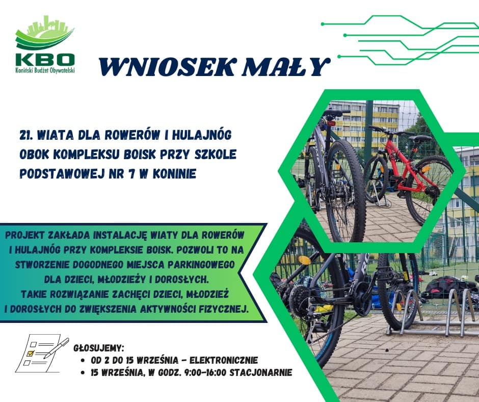 21. Wiata dla rowerów i hulajnóg obok kompleksu boisk przy Szkole Podstawowej nr 7 w Koninie.