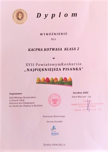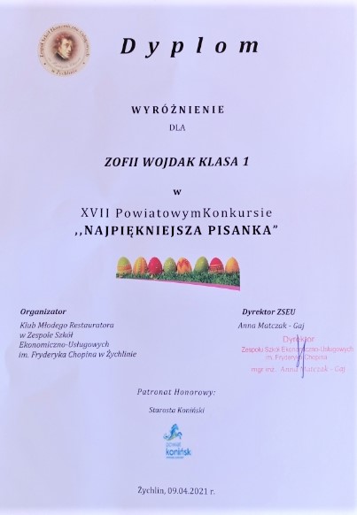 W marcu 2021 uczniowie klas pierwszych, drugich i trzecich wzięli udział w XVII Powiatowym Konkursie Na Najpiękniejszą Pisankę organizowanym przez ZSEU w Żychlinie.